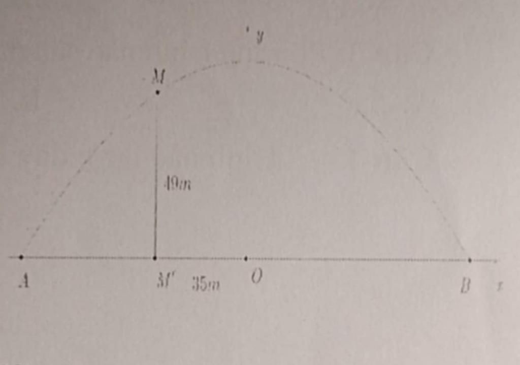 Cổng Arch tại thành phố St Louis của Mỹ có hình dạng là một parabol (hình vẽ). Biết rằng, trên thành cổng, tại vị trí có độ cao 49 (m) so với mặt đất, người ta thả một sợi dây chạm đất (dâycăng thẳng theo phương vuông góc với đất). Vị trí chạm đất của dầu sợi dây cách điểm chính giữa chân cổng một đoạn 35 (m). Hỏi cổng Arch tương ứng với phương trình đồ thị hàm số nào?