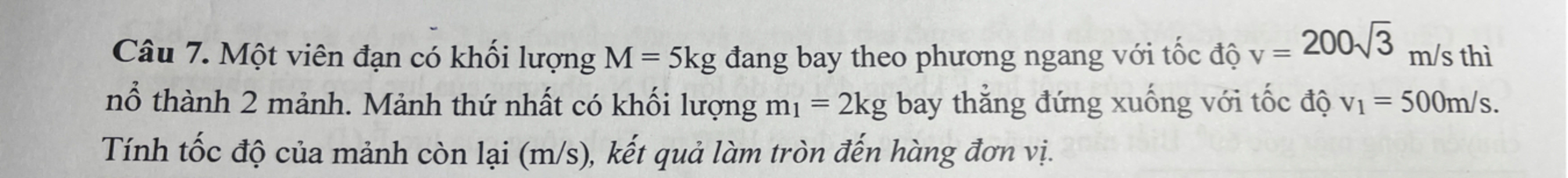 `to v_2 = sqrt[(Mv)^2 + (m_1 v_1)^2]/[M - m_1] = sqrt[(5.200sqrt3)^2 + (2.500)^2]/[5 - 2] = 2000/3 approx 667` $(m/s)$