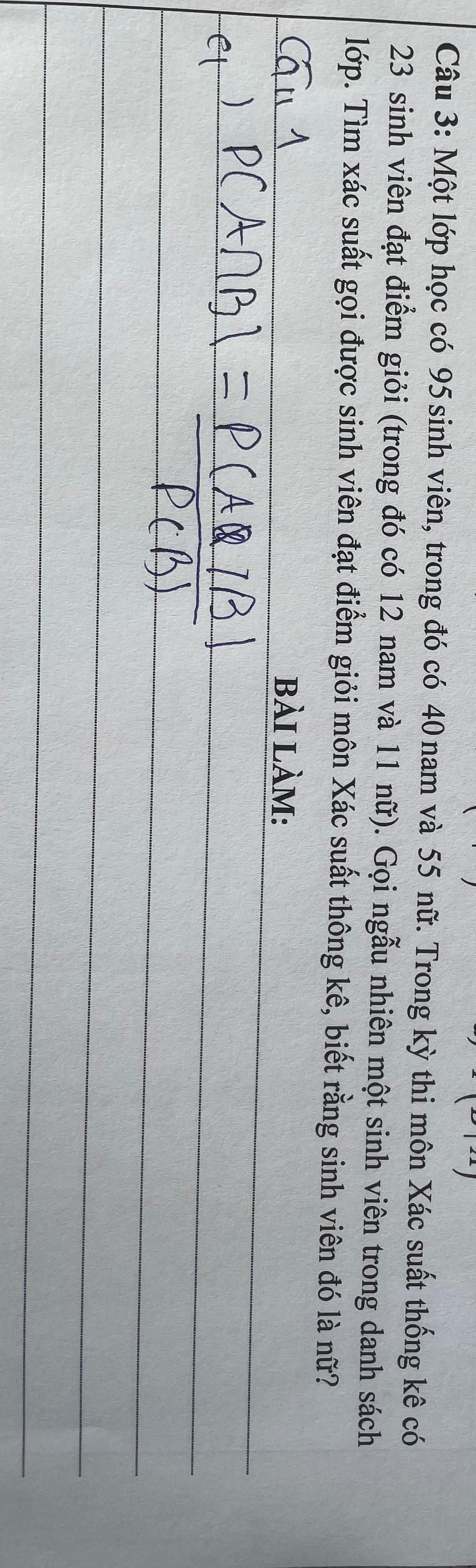 Câu 3: Một lớp học có 95 sinh viên, trong đó có 40 nam và 55 nữ. Trong kỳ thi môn Xác suất thống kê có