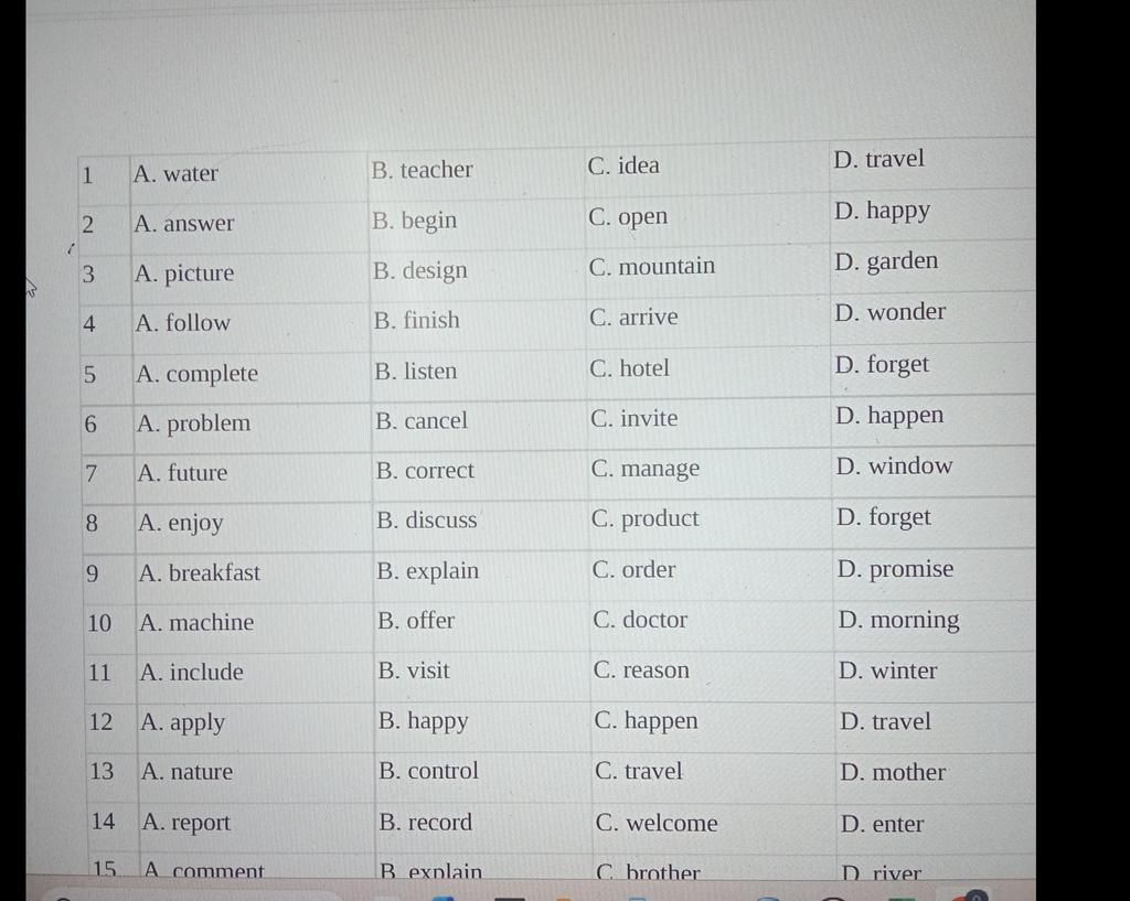 Các anh chị hay các bạn ơi giúp em bài nì với để bài là chọn từ có trọng âm khác các từ khác mà em ko hiểu?