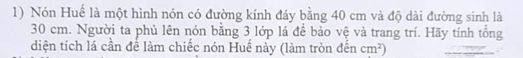 Tổng diện tích lá cần để làm Nón Huế là :