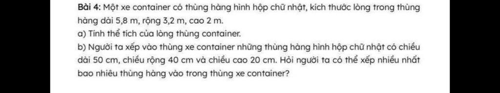 `a)` Thể tích thùng hàng là `:`