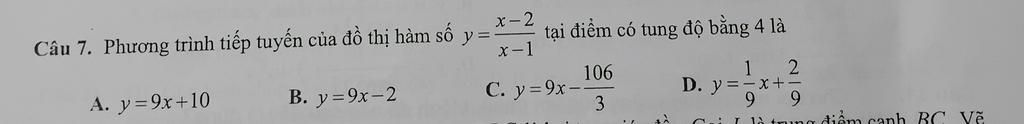 Vì phương trình thuyết tuyến của đồ thị hàm số y=$\frac{x-2}{y-1}$ tại điểm có tung độ bằng 4(y=4) nên 4=$\frac{x-2}{y-1}$ Từ đó tính ra x=2/3