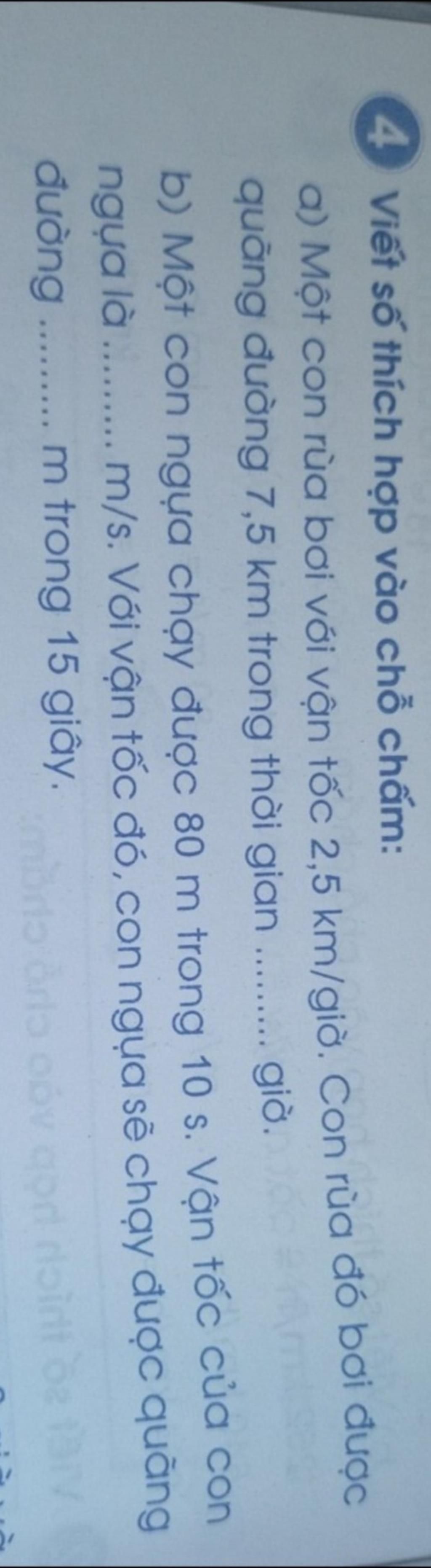 a) Con rùa bơi quãng đường `7,5km` trong :