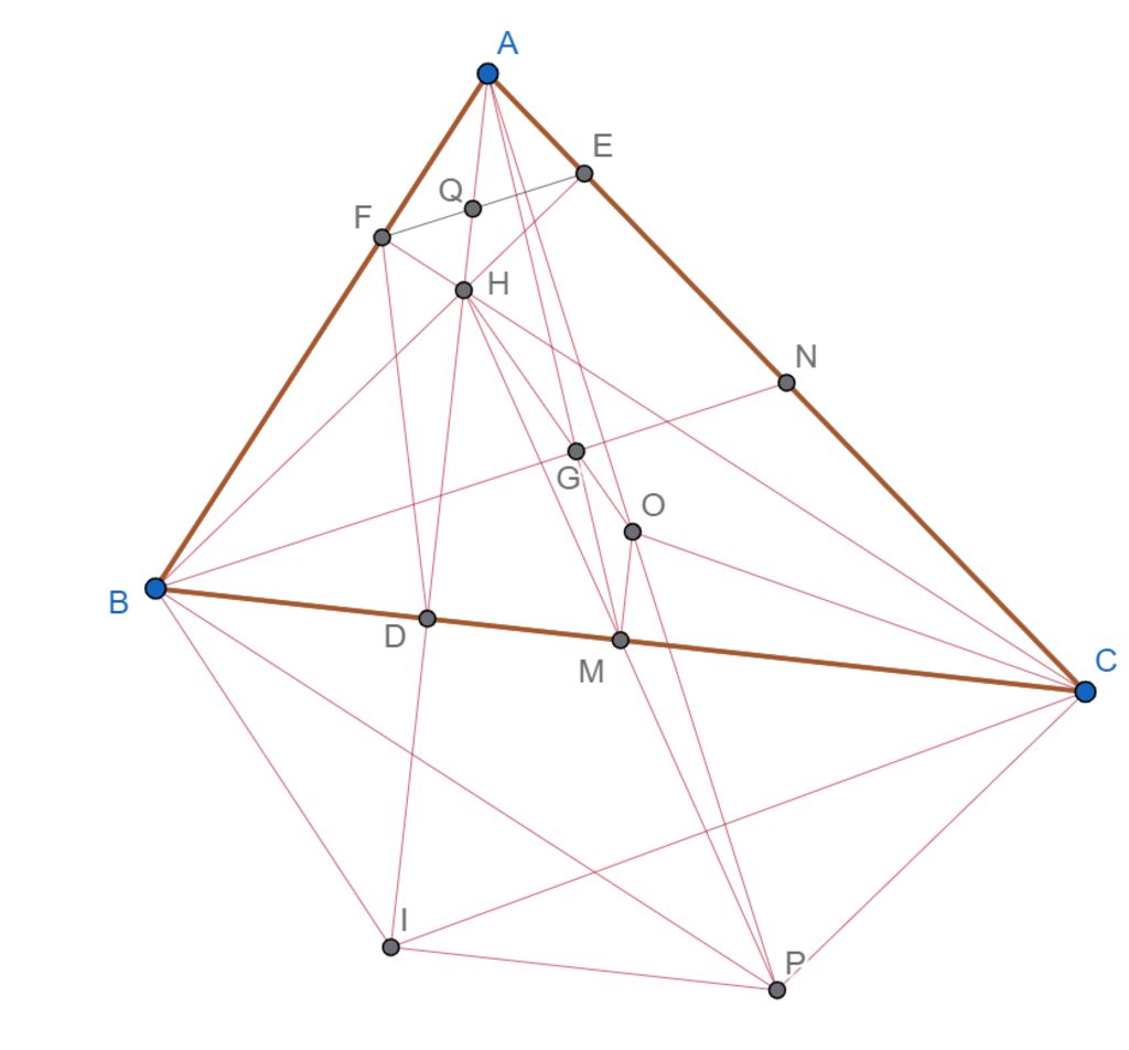 Cho tam giác ABC nhọn có các đường cao AD, BE, CF cắt nhau tại H. Gọi M, N lần lượt là trung điểm của BC, AC; gọi I, P lần lượt là điểm đối xứng của H qua D và M.