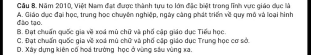 ⇒ Năm 2010, Việt Nam được công nhận đã hoàn thành mục tiêu phổ cập giáo dục tiểu học và xóa mù chữ theo chuẩn quốc gia. Đây là một trong những thành tựu nổi bật, đánh dấu bước tiến quan trọng trong nỗ lực nâng cao dân trí và phát triển nguồn nhân lực.Hãy giúp mọi người biết câu trả lời này thế nào?