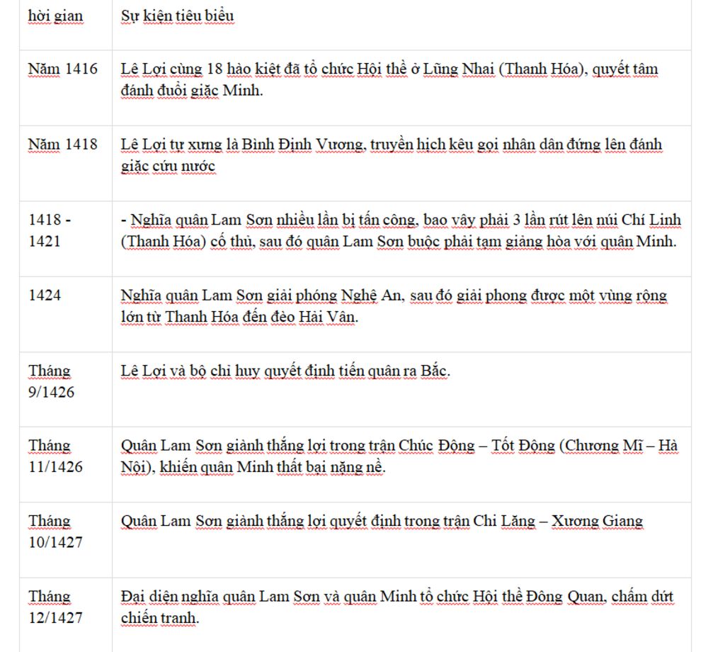 # Hãy lập bảng hệ thống những sự kiện tiêu biểu của cuộc khởi nghĩa Lam Sơn (thời gian, sự kiện tiêu biểu, kết quả)