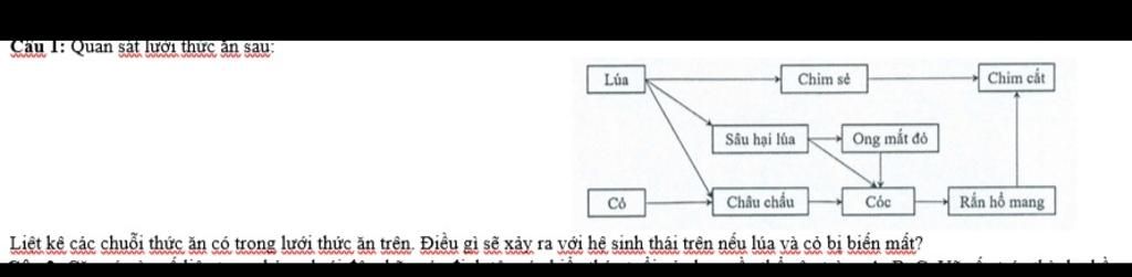 Sâu hại lúa và châu chấu sẽ không còn thức ăn → giảm số lượng → ảnh hưởng đến các loài ăn chúng như cóc, chim sẻ, ong mắt đỏ → kéo theo rắn hổ mang và chim cắt cũng giảm vì thiếu con mồi.