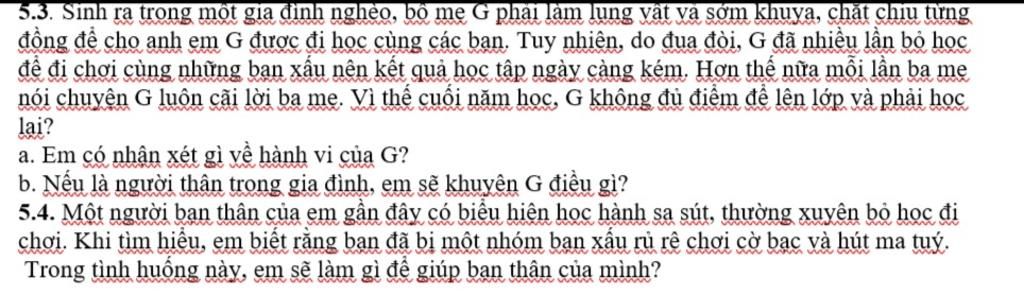 b, Nếu là người thân của G em sẽ khuyên G không nên làm như vậy vì để có tiền cho G đi học thì bố mẹ G đã rất vất vả làm lụng sớm hôm để lo tiền học phí cho G, bố mẹ G muốn G học hành chăm chỉ để sau này không khổ như họ. Vì vậy G hãy thay đổi và hoàn thiện bản thân để không phụ lòng bố mẹ G.