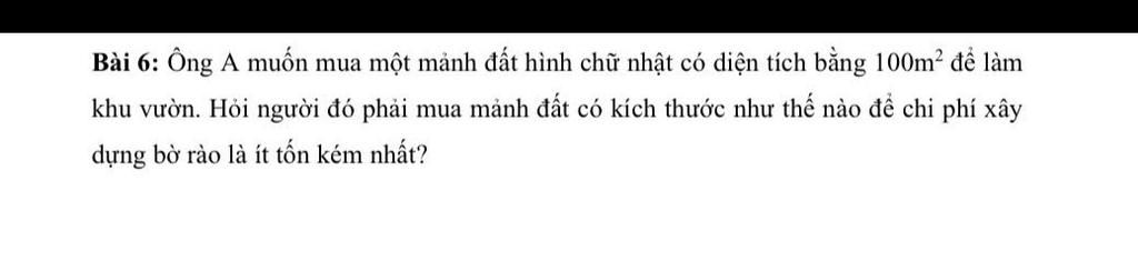 Để kích thước mua chi phí xây dựng bơ rào là ít tốn kém nhất thì chu vi của mảnh đất phải là bé nhất.