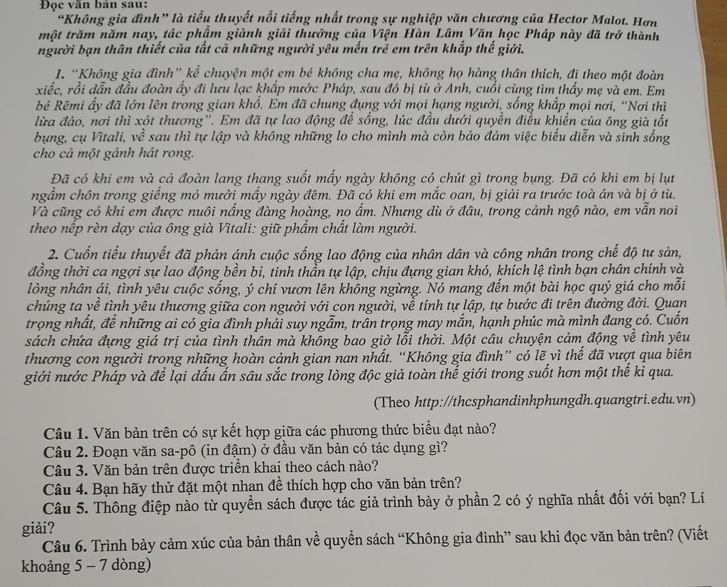 Qua văn bản trên, em cảm nhận được sự xúc động của bản thân mình dành cho hành trình đày rẫy nhưng gian truân, vất vả nhưng lại rất ý nghĩa của cậu bé Rémi. Mặc dù không có gia đình ở bên đồng hành, bảo vệ và trở che, nhưng cậu bé vẫn giữ được ho mình những phẩm chất tốt đẹp, lòng nhân ái và cả sự kiên cường. Văn bản này đã khơi dậy trong em 1 tinh thần biết yêu thương, giúp đỡ và cảm thông cho những hoàn cảnh xung quanh mình hơn, bên cạnh đó chúng ta phải luôn giữ gìn những phẩm chất, đạo đưc và lối sống giản dị để chúng ta sống tốt hơn mỗi ngày. Đây không chỉ là bài học sâu sắc về cách làm người mà còn là bài học về cách làm người vượt lên mọi nghịch cảnh.