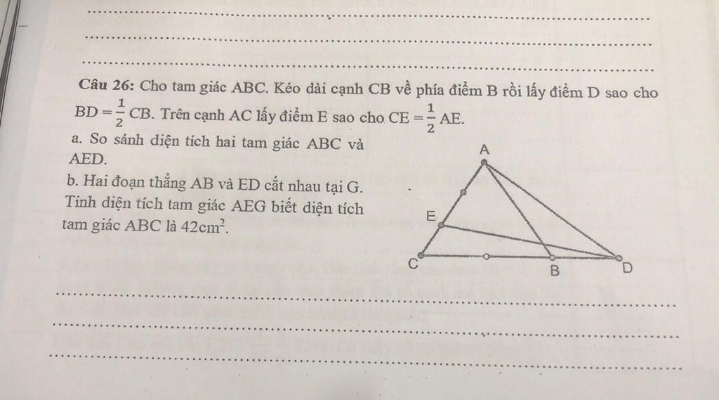 Diện tích tam giác `AEG` là : `2/3 xx 4/9 xx 42 = 12,44(cm^2)`