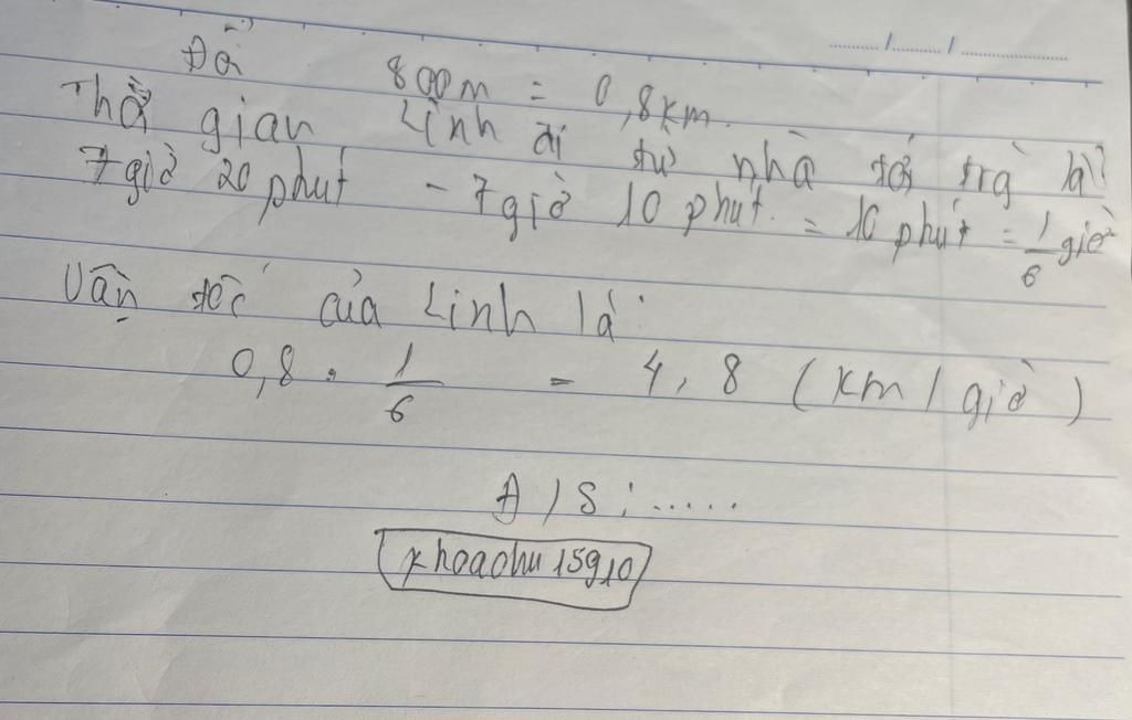 Lúc 7 giờ 10 phút, linh đi bộ từ nhà và đến trường lúc 7 giờ 20 phút. Biết quãng đường từ nhà linh đến trường dài 800 m. Tính vận tốc của linh.