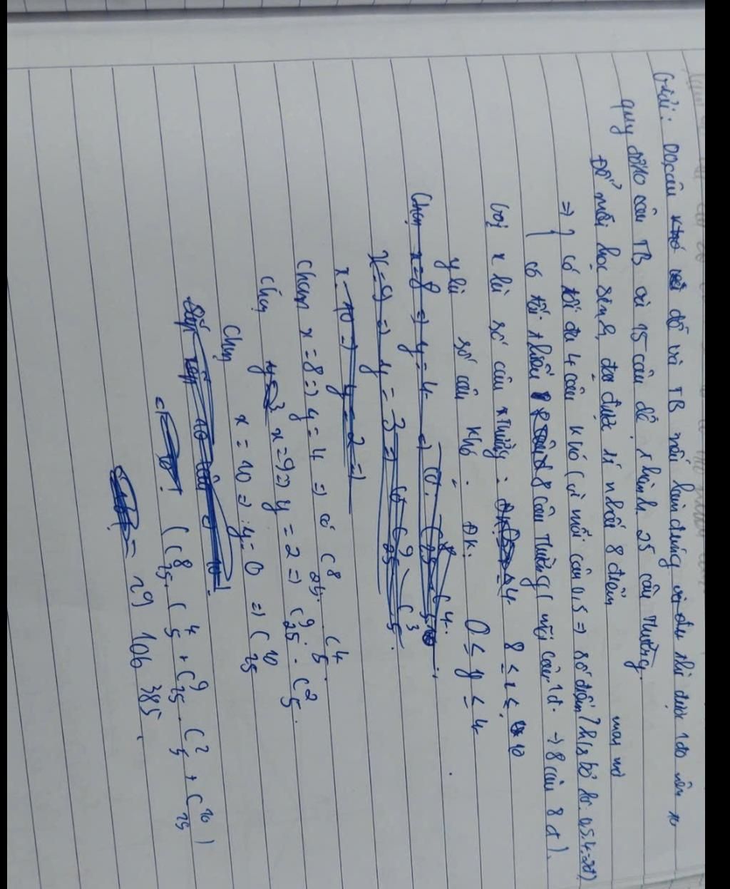 Trong một môn học, thầy giáo có 30 câu hỏi khác nhau, trong đó có 5 câu khó, 10 câu trung bình và 15 câu dễ. Thầy giáo chọn ra 1 đề kiểm tra gồm 10 câu, đúng câu hỏi khó được 0,5 điểm, đúng các câu khác được 1 điểm. Thầy giáo dự kiến học sinh sẽ chắc chắn làm được các câu dễ và trung bình. Hỏi có bao nhiêu cách làm đề kiểm tra để học sinh được ít nhất 8 điểm theo dự kiến.