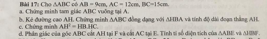 d. Phân giác của góc ABC cắt AH tại F và cắt AC tại E. Tính tỉ số diện tích của AABE ...