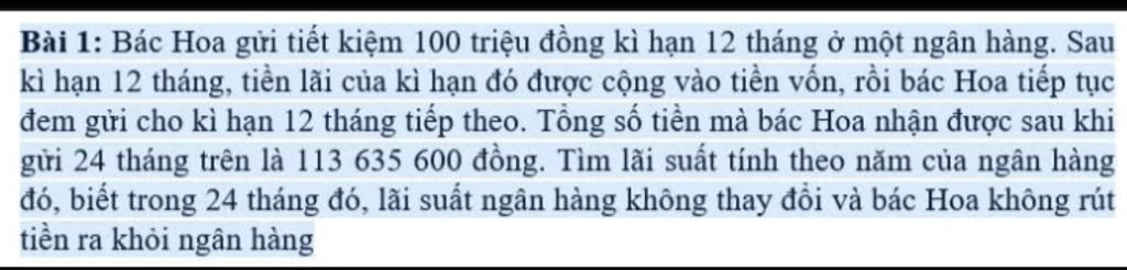 `+)` Tổng tiền sau `12` tháng đầu là: `100+100x` (triệu đồng)