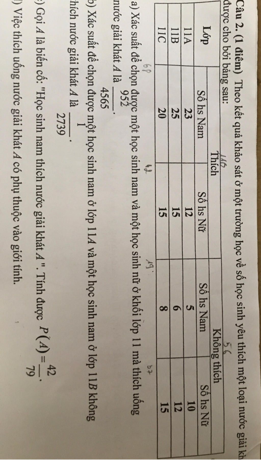 Câu 2. (1 điểm) Theo kết quả khảo sát ở một trường học về số học sinh yêu thích một loại nước giải kh