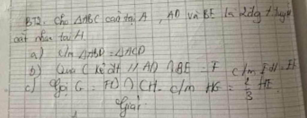 Bài tập 2: Cho tam giác ABC cân tại A, AD và BE là 2 đường trung tuyến cắt nhau tại H