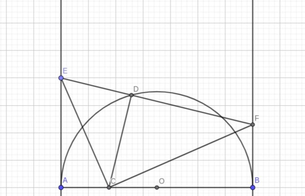 Câu 5. (3,0 điểm) Cho nửa đường tròn (O; R), đường kính AB = 2R. Trên nửa mặt phẳng bở AB cùng phía với nửa đường tròn vẽ hai tia tiếp tuyến Ax, By với nửa đường tròn (O) tại A và B. Gọi C là trung điểm của OA. Trên Ax lấy điểm E, qua C về đường thẳng vuông góc với CE và cắt By tại F. Kẻ CD vuông góc với EF (D thuộc EF).