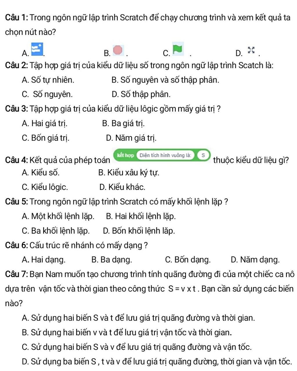 `-` Câu 5: D. (Scratch có bốn khối lệnh lặp cơ bản.)