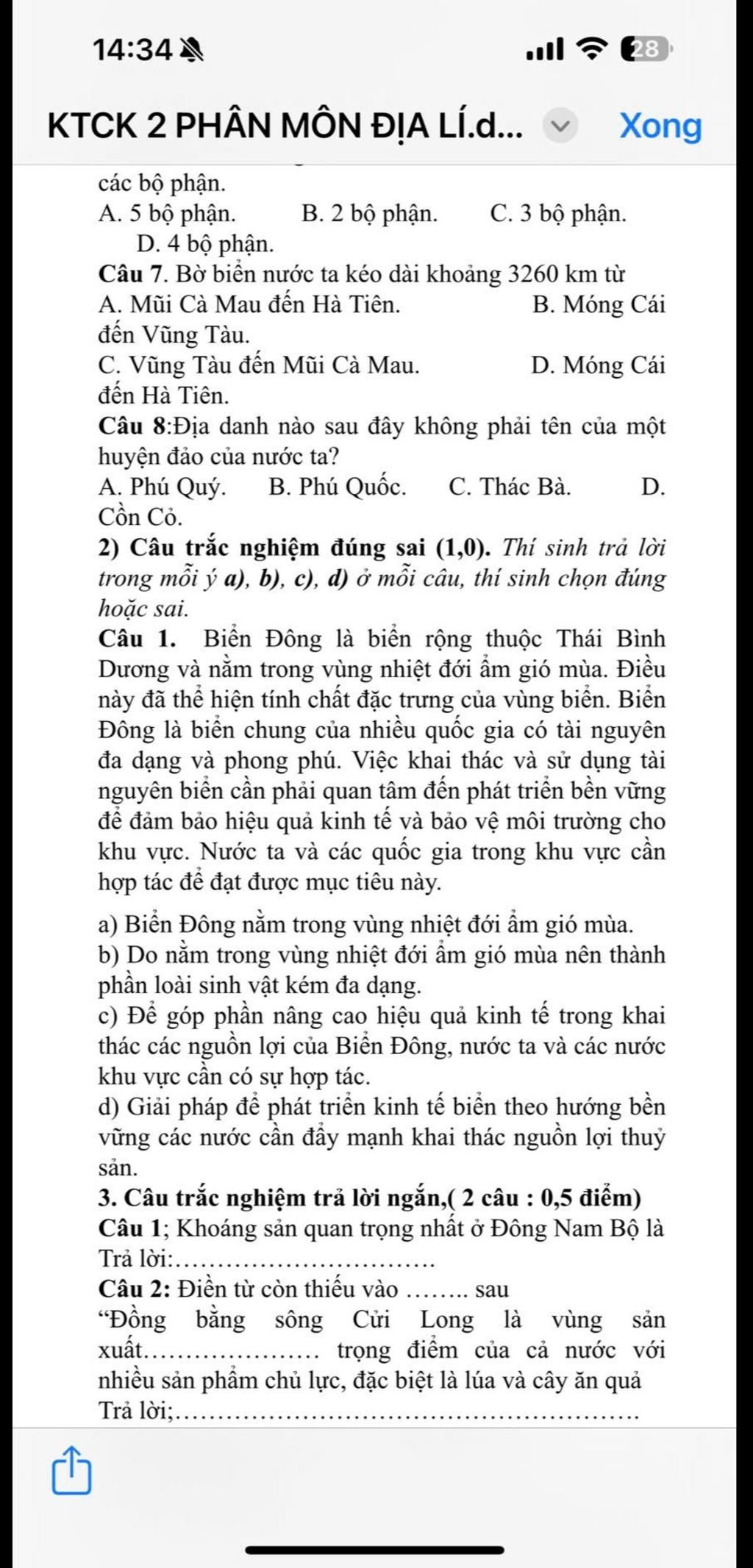 7. D → Bờ biển nước ta kéo dài khoảng 3260 km từ Móng Cái đến Hà Tiên.