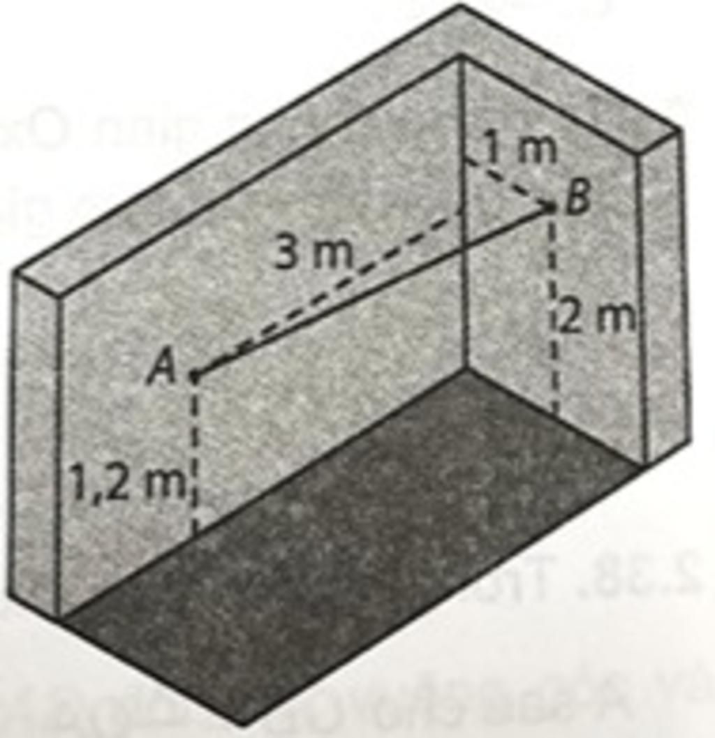 Hình bên mô tả hai bức tường gạch được xây vuông góc với nhau và cùng vuông góc với mặt đất. Một người thợ xây căng dây giữa hai bức tường. Đầu A của sợi dây nằm trên bức tường thứ nhất, cách bức tường thứ hai là 3 m và cách mặt đất là 1,2 m. Đầu B của sợi dây cao hơn đầu A và nằm trên bức tường thứ hai, cách bức tường thứ nhất 1m. Biết rằng góc giữa dây căng và mặt đất không vượt quá 30 độ, hỏi khoảng cách từ B đến mặt đất tối đa là bao nhiêu mét?