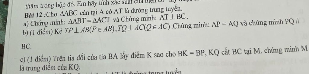 Bài 12 :Cho AABC cân tại A có AT là đường trung tuyến.