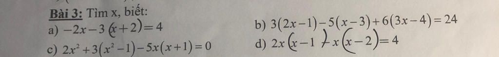 `c)` `2x^2+3(x^2-1)-5x(x+1)=0`
