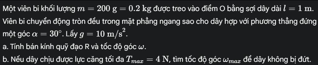 `-` Bán kính quỹ đạo: $R=l.sin\left(\alpha \right)=1.sin\left(30\right)=0,5\left(m\right)$