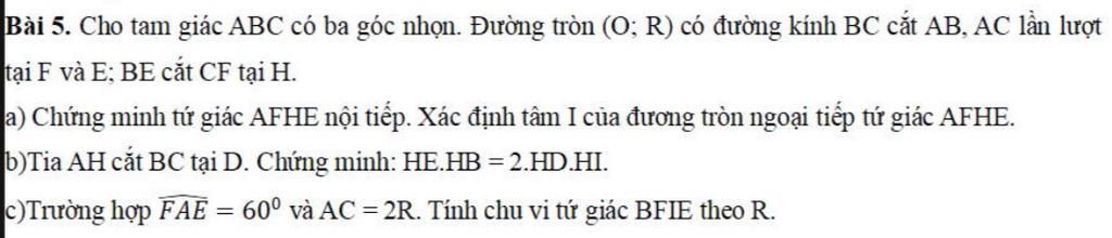 a) Chứng minh tứ giác AFHE nội tiếp. Xác định tâm I của đương tròn ngoại tiếp tứ giác AFHE.