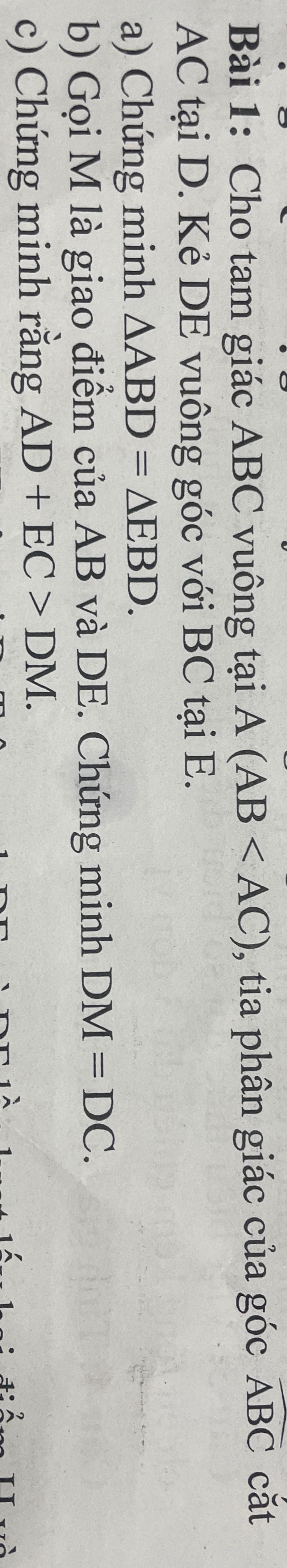 `+)` `\triangle` `ABC` vuông tại `A` `(AB < AC)`. Kẻ `DE ⊥ AC` tại `D`, `DE ⊥ BC` tại `E.` `M` là giao điểm của `AB` và `DE.`