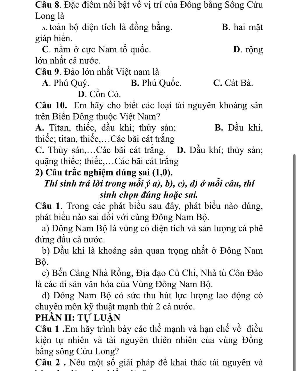 10. D → Biển Đông của Việt Nam có nhiều loại tài nguyên khoáng sản như dầu khí, thủy sản, quặng thiếc, titan và các bãi cát trắng. Đây là nguồn tài nguyên phong phú, có giá trị kinh tế cao, đóng vai trò quan trọng trong phát triển kinh tế biển.
