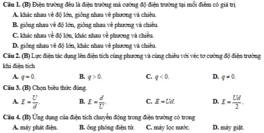 `1)` Lý thuyết: Điện trường đều là điện trường mà cường độ điện trường tại mọi điểm có giá trị giống nhau về độ lớn, phương, chiều.