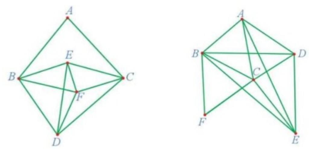 Đồ thị thứ nhất có `6` đỉnh có đỉnh `A` bậc `2` còn lại `B,C,D,E,F` đều bậc `4` nên mỗi cặp đỉnh không kề nhau bất kì có tổng `2+4>=6`. Do đó theo định lí Ore, đồ thị này có chu trình Hamilton.