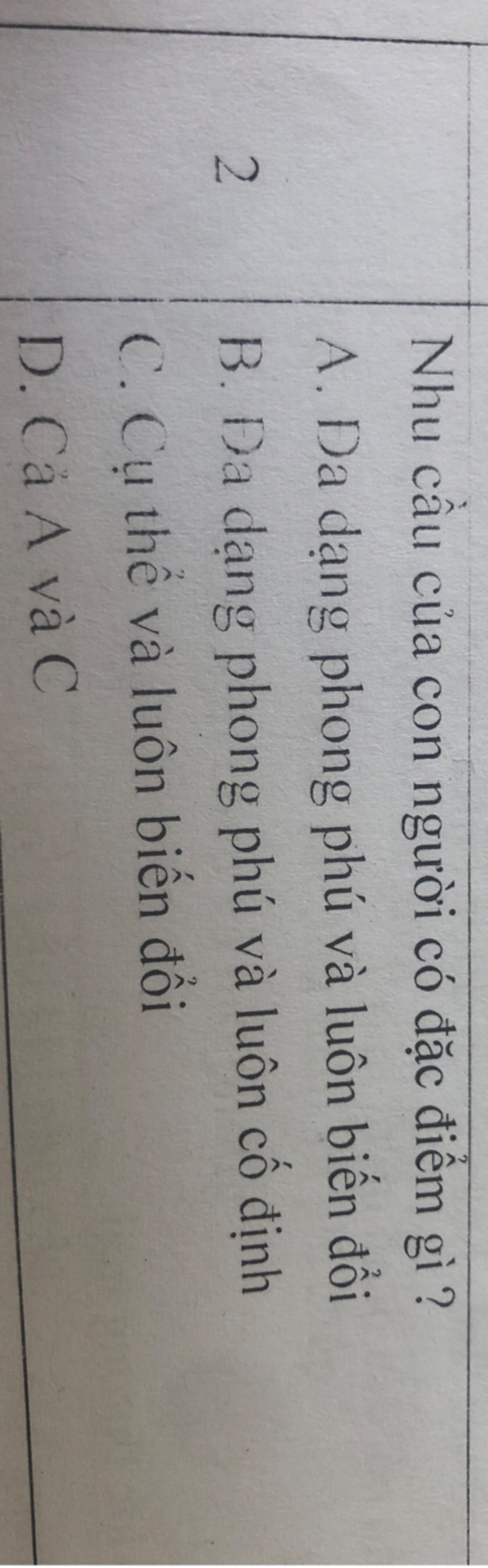 Giải thích: Nhu cầu của con người không ngừng thay đổi theo thời gian, điều kiện sống, hoàn cảnh xã hội và sự phát triển của bản thân chúng ta, nhu cầu của con người rất đa dạng và không ngừng thay đổi để phù hợp và diễn ra cụ thể trong từng hoàn cảnh.