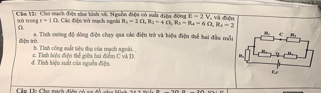 {I_5} = I = \dfrac{E}{{R + r}} = \dfrac{2}{{6 + 1}} = \dfrac{2}{7}A\\
