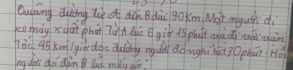 Quảng đường từ A đến B dài 90 km một người đi xe máy xuất phát từ A lúc 6 giờ 15 phút và đi với vận tốc 45km/giờ đọc đường người đó nghĩ hết 30 phút hỏi người đó đến B lúc mấy giờ?