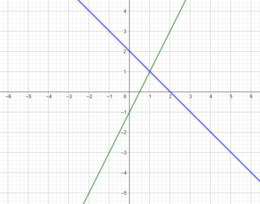 Dths `y=2x-1` là màu xanh lá còn `y=-x+2` là màu xanh dương