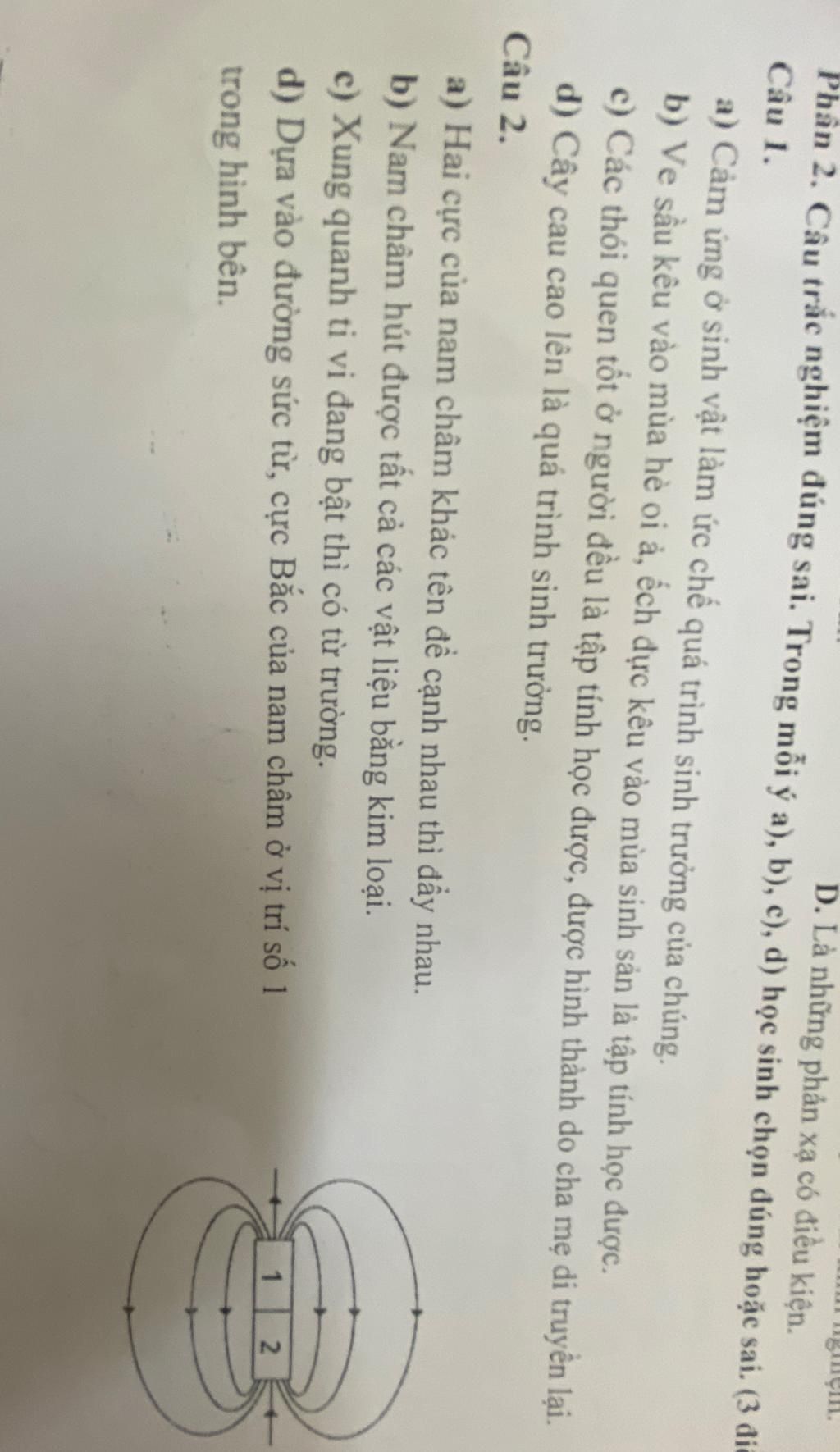 Phân 2. Câu trắc nghiệm đúng sai. Trong mỗi ý a), b), c), d) học sinh chọn đúng hoặc sai. (3 đi