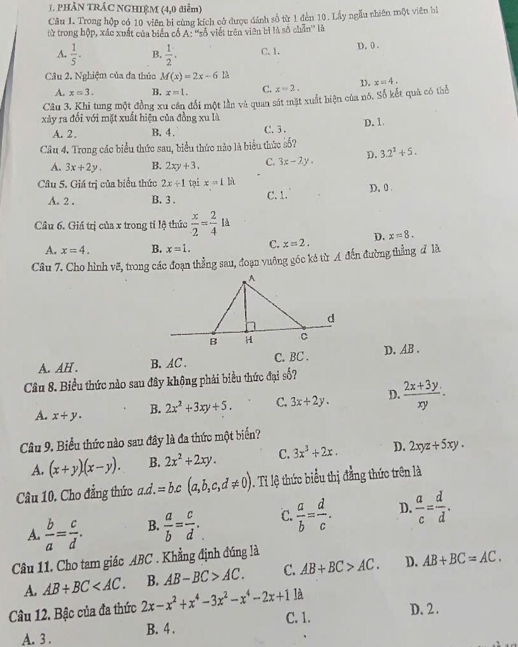 I. PHẦN TRẮC NGHIỆM (4,0 điểm)