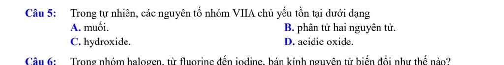 Trong tự nhiên các nguyên tố nhóm VIIA chủ yếu tồn tại dưới dạng phân tử hai nguyên tử