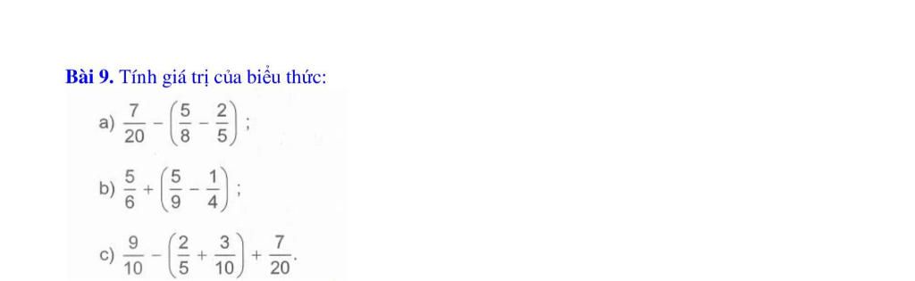 c)$\frac{9}{10}$ - ($\frac{2}{5}$ + $\frac{3}{10}$ )+ $\frac{7}{20}$