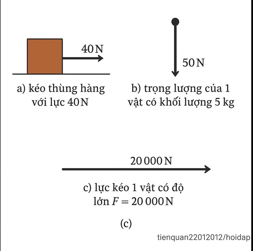 hãy vẽ mũi tên biểu diễn lực trong trường hợp sau đây a) kéo thùng hangf với lực 40N theo phương ngang chiều từ trái sang phải ( tỉ xích 1cm ứng với 10n) b)trọng lượng của 1 vật có khối lượng 5 kg tỉ xích 1cm ứng với 10n c) lực kéo 1 vật có độ lớn f= 20 000n phương ngangchieeuf từ trái sang phải tỉ xích 1cm ứng với 4 000n