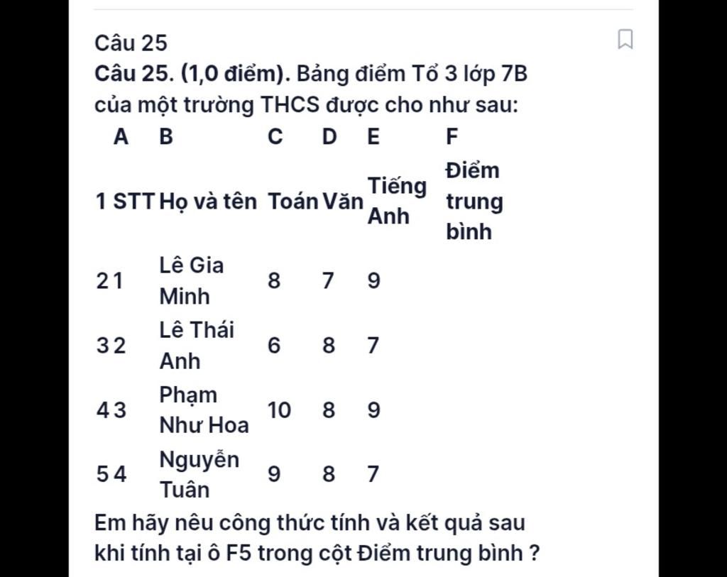 Kết quả sau khi tính tại ô F`5` trong cột Điểm trung bình là: