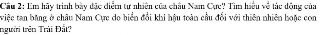 +)Về sinh vật -> giới sinh vật nghèo nàn, phần lục địa bên trong không có thực-động vật sinh sống, ven lục địa có các loaif thực vật bậc thấp(rêu-địa y-tảo-nấm) và động vật chịu được lạnh ( chim cánh cụt-chim biển-hải cẩu-...) ; ở vùng biển phong phú hơn -> nổi bật=cá voi xanh