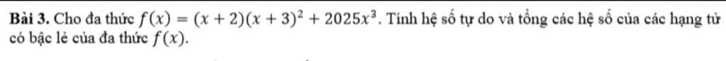 `\text{Gọi g(x) là: }``(x+2)(x+3)^2`$\\$`\text{Ta có: }``g(x)= (x+2)(x+3)^2`$\\$`g(x)= (x+2)(x+3)(x+3)`$\\$`g(x)=[(x+2)*x+(x+2)*3](x+3)`$\\$`g(x)=[x*x+x*2+x*3+2*3](x+3)`$\\$`g(x)=(x*x+x*2+x*3+2*3)x+(x*x+x*2+x*3+2*3)*3`$\\$`g(x)=(x*x+x*2+x*3+2*3)x+(x*x+x*2+x*3+2*3)*3`$\\$`g(x)=x*x*x+x*2*x+x*3*x+2*3*x+x*x*3+x*2*3+x*3*3+2*3*3`$\\$`g(x)=x^3+2x^2+3x^2+6x+3x^2+6x+9x+18`$\\$`g(x)=x^3+(2x^2+3x^2+3x^2)+(6x+6x+9x)+18`$\\$`g(x)=x^3+8x^2+21x+18`$\\$`=>f(x)=x^3+8x^2+21x+18+2025x^3`$\\$`f(x)=(x^3+2025x^3)+8x^2+21x+18`$\\$`f(x)=2026x^3+8x^2+21x+18`$\\$`\text{Do đó: hệ số tự do của f(x) là }`$\\$`\text{f(x) có bậc lẻ là: }``2026x^3;21x`$\\$`\text{Do đó: Tổng các hệ số của hạng tử f(x) có bậc lẻ là: }`$\\$`\text{2026+21=2047}`$\\$`\text{Vậy, hệ số tự do của f(x) là 18; tổng các hệ số của các hạng tử f(x) có bậc lẻ là: 2047}`$\\$`color{#FDFDFD}{#}color{#E9FDFD}{H}color{#D2FCFD}{o}color{#BEFCFD}{r}color{#AAFCFD}{w}color{#93FBFD}{a}color{#7FFBFD}{d}color{#6AFBFD}{T}color{#56FBFD}{P}color{#3FFAFD}{h}color{#2BFAFD}{i}color{#17FAFD}{l}`