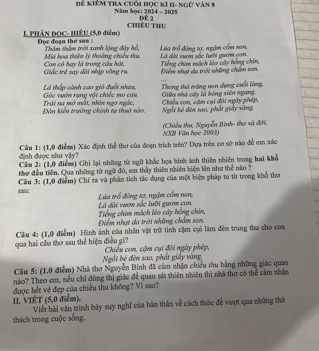 $-$ Những từ ngữ khắc họa hình ảnh thiên nhiên trong hai khổ thơ đầu: thăm thẳm trời xanh, mùi hoa thiên lý thoảng chiều thu, lá thấp cành cao gió đuổi nhau