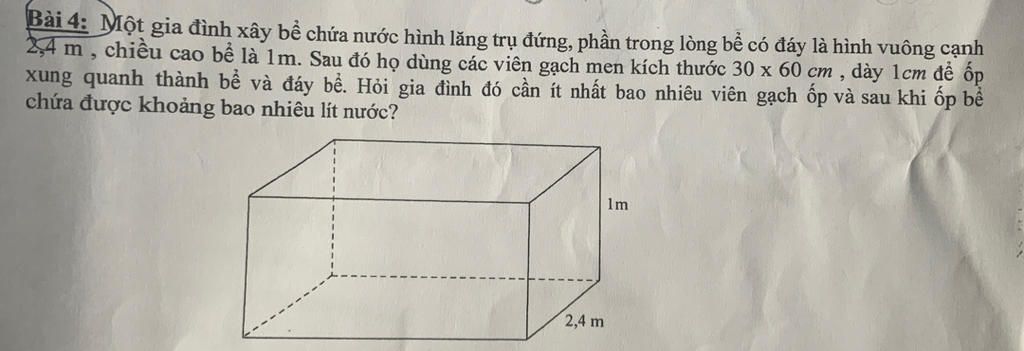 Thể tích nước chứa được là : `5,76(m^3)=5760(l)`
