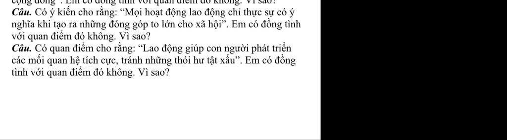`-` Em không đồng tình với ý kiến cho rằng: “Mọi hoạt động lao động chỉ thực sự có ý nghĩa khi tạo ra những đóng góp to lớn cho xã hội”. Vì mọi hoạt động lao động đều thực sự có ý nghĩa dù khi tạo ra những đóng góp to hay nhỏ lớn cho xã hội `.`