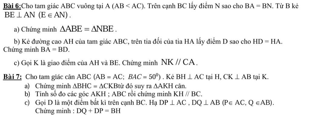 Bài 6:Cho tam giác ABC vuông tại A (AB < AC). Trên cạnh BC lấy điểm N sao cho BA = BN. Từ B kẻ